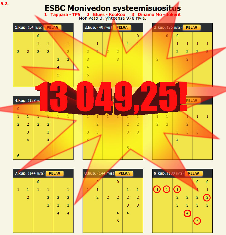 ESBC Monivetolinjalta alla olevasta linkistä saat tarkat arviomme kaikkiin kohteisiin ja geneettisillä algoritmeillä pelijakaumahuomioiden optimoidun valmiin systeemisuosituksen. Tasan viikko sitten asiakkaamme lunastivat makoisan 13 049,25 -kertoimentämän näköisellä pelikokonaisuudella.