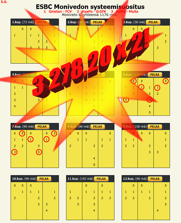 Voit myös halutessasi tavallisillakin monivetokierroksilla tehdä itsesi näköiset systeemit kertomiemme parhaiden pelitulosten ja kierrätystulosten avulla, kuten asiakkaamme ML teki viiden kohteen SuperMonivetokierroksella.